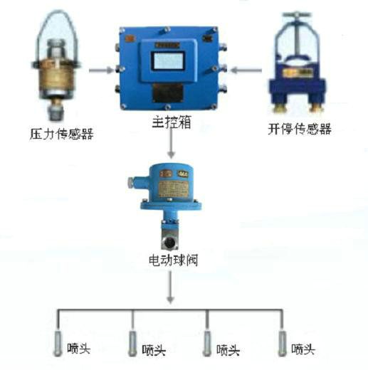 只有水壓傳感器檢測到采煤機(jī)水采水路中有一定的水壓(或工作燈開啟)時(shí),才能允許啟動(dòng)采煤機(jī)。采煤機(jī)開動(dòng)后,開停傳感器(或光控傳感器)將信號(hào)送入主控箱,主控箱控制電動(dòng)球閥開啟,實(shí)現(xiàn)對(duì)產(chǎn)塵點(diǎn)進(jìn)行噴霧降塵。采煤機(jī)停機(jī)(或采煤機(jī)工作燈關(guān)閉)后,主控箱控制電動(dòng)球閥延時(shí)一定的時(shí)間后關(guān)閉,停止噴霧降塵。